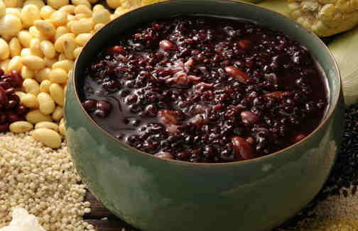 做法:将黑豆、紫糯米淘洗干净放入锅中,再依次放入黑芝麻、核桃仁、桂圆肉、松子仁、大枣、红糖,加水煮成粥即可。