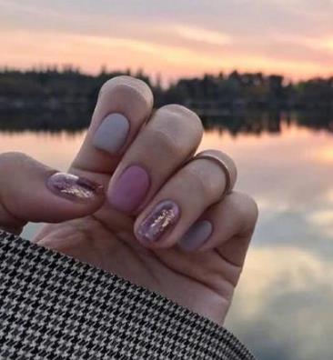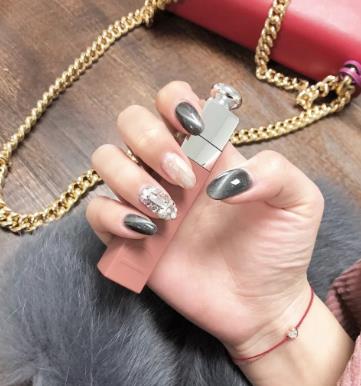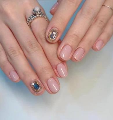 像这样比较淡雅的颜色,做成纯色美甲,一方面有着很温柔的气质,另个一方面又显得比较低调,让指尖感觉少了一些亮点。我们可以用两个不同色号的颜色做成跳色美甲,这样在视觉上形成了对比,会显得更有亮点,也可以搭配上整甲造型的亮片美甲,可以起到提亮效果,让整款美甲更有高级感。