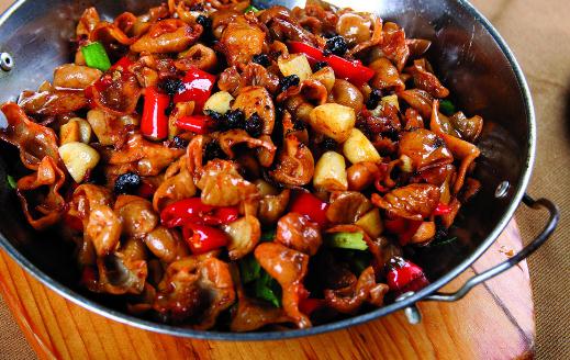 干锅发源于四川德阳,流行于四川、湖南等吃辣地区。主菜一般选用鸡肉、牛蛙、腊肉,底菜用香芹、青椒、洋葱、粉皮等,味道麻辣鲜香。相比火锅,干锅的汤汁相对较少,油脂更多,在小火加热下,食物不易粘锅,还能保温。不过,持续加热的特点让干锅存在不少健康隐患。