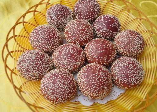 紫薯,糯米粉,面粉,白芝麻,红豆沙。