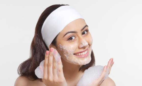 2、早上用皂性洁面产品,着重在容易出油的部位轻轻按摩,稍后冲净。