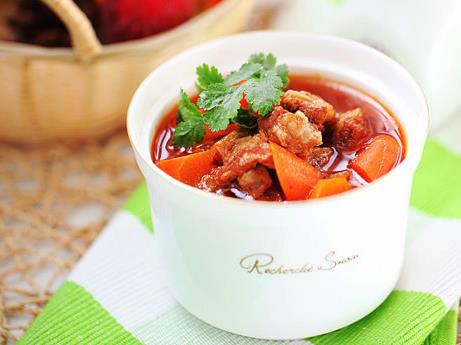 做法:红萝卜去皮洗净,切角形。牛腩洗净,放入开水中煮5分钟,取出冲净,再放入开水中煮20分钟,取出切厚块,汤留用。烧热锅,下油2汤匙爆香姜片、葱段、豆瓣酱、番茄酱、甜面等酱,加入牛腩爆炒片刻,加酒,放入调味料及八角待烧开,改慢火煮30分钟,加入红萝卜煮至熟,以少许生粉水打芡,上盘时放上芫荽即成。