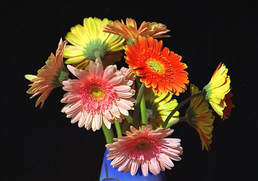 非洲菊色彩在盛夏期,尤其在干旱缺水情况下,花瓣色彩黑淡;而在适温的9~10月或翌年3~6月期间所开的花,色彩鲜艳。这表明;非洲菊对温度和光照强度反映较为敏感,夏季需保持土壤的湿润、不受旱,遮盖50%透光率的遮光网,并向叶面喷雾,以增加空气湿度和降低温度。