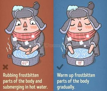 若摩擦冻伤部位可能会加剧伤害,可以将冻伤的部位泡在冷水里,等身体逐渐回温,切记不要泡热水,免得冻伤更严重。