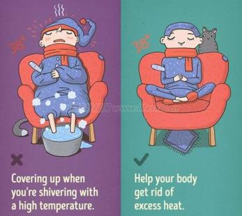 发烧的时候会出汗,这是因为体内温度高。如果这时候将自己用更多衣物包起来,会让体内温度上升的更快。发烧、发抖的时候需要的是降温,而不是更温暖。