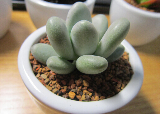 星美人是景天科多肉植物中的一个经典品种,其肉质叶浑圆可爱,色彩素洁淡雅。而用叶片扦插所产生的幼株叶片排列紧凑,犹如一粒粒珠圆玉润的卵石。常用小盆栽种,点缀书桌、几案、窗台等处,如同玉石雕琢的工艺品,非常奇特。