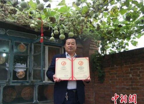 捧着刚刚收到的世界纪录证书,相机镜头前的郑宝平高兴得合不拢嘴。为他赢得这证书的,竟是他家院子里的一株葫芦秧结出的421个葫芦。