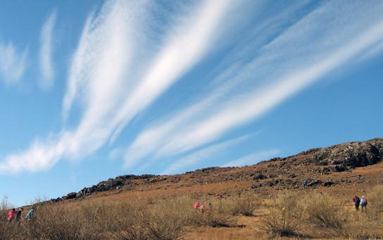 山地行进不要过高估计自己的体力,疲劳时,就应适时休息。不要走到快累垮了才休息,那样不容易恢复体力,再走也提不起劲。正确的方法是大步走一段,再放松缓步慢行一段,或停下来休息一会,调整呼吸。站着休息时,不要卸掉装具背包,可以在背包下支撑一根木棍,以减轻身体负重。若天气冷,不要坐在石头上休息,石头会迅速将身体的热量吸走。