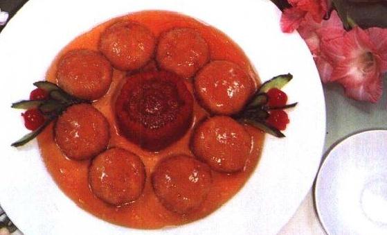 5、坐锅点火放油,油至7—8成热时放入蒜末炒出蒜香末,加入葱姜末煸炒,倒入芡汁,倒入炸好的丸子翻炒上汁,放入豌豆尖淋上香油即可装盘 特点:色泽深红,松嫩肉鲜,味酸甜。