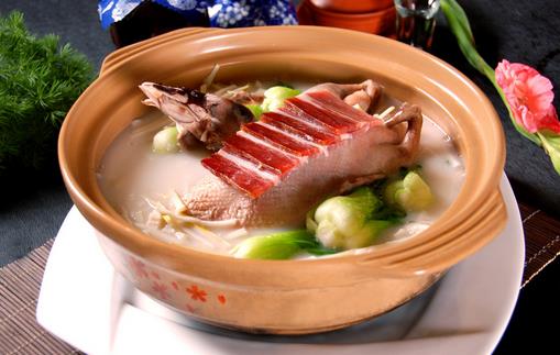 用于制汤的原料,通常为动物性原料,如鸡肉、鸭肉、猪瘦肉、猪肘子、猪骨、火腿、板鸭及鱼类等。采购时应注意必须鲜味足、异味小、血污少。这类食品含有丰富蛋白质和核苷酸等,家禽肉中能溶解于水的含氮浸出物,是汤鲜味的主要来源。煲汤材料的新鲜并不是指传统的“肉吃鲜杀,鱼吃跳”的时鲜,而是指鱼、畜、禽杀死后3小时~5小时,此时鱼、畜或禽肉的各种酶使蛋白质、脂肪等分解为人体易于吸收的氨基酸、脂肪酸,味道也最好