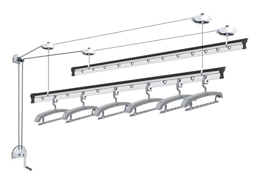 1、首先,我们来看一下手摇升降衣架的产品组成:晾杆、手摇器、顶座、转向轮、手摇器以及连接这一切的钢丝绳。