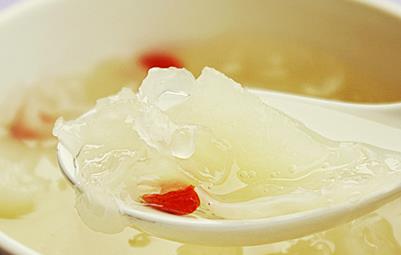 银耳5克,冰糖50克。将银耳放入盆内,以温水浸泡30分钟,待其发透后摘去蒂头、拣去杂质;将银耳撕成片状,放入洁净的锅内,加水适量,以武火煮沸后,再用文火煎熬1小时,然后加入冰糖,直至银耳炖烂为止。