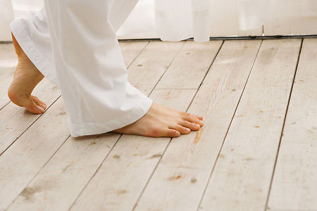 地板受潮之后没有及时处理的话很容易会长出霉斑,时间拖久了还会大面积发霉。若发现地板有少量霉斑,可以用温性漂白水和水以1:3的比例混合,沾湿抹布擦拭地板,直到去掉霉斑。漂白水的浓度不宜过高,否则会破坏地板表面的地板蜡。若地板内部已经发生霉变了,需要将霉变地板拆除,换上新地板,以免感染其他完好的地板。