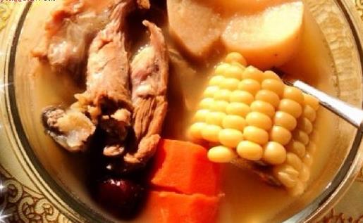 玉米红萝卜脊骨汤有益肠胃、润肺燥的功效,玉米能止血、利尿,又能降胆固醇,红萝卜宽中行气、健胃助消化,猪脊骨补阴益髓又健筋骨,此汤对糖尿病者,以及 消化不良、食欲不振的高血压者特别适宜。胡萝卜除含维生素A外,还含有一定糖、蛋白质等营养素,可促进血红蛋白的生成,故有补血作用;排骨可益精髓、强骨。此汤有润燥滋阴,养筋强骨之功效。小儿行动迟缓,筋骨发育欠佳食之有疗效。