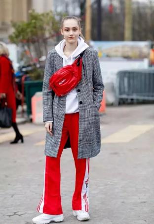 用清新的白色连帽卫衣搭配亮丽的红色运动裤让你绝对出彩,再加上灰色大衣的组合,整体look非常契合,休闲时髦。