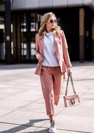 今季还非常流行玫瑰粉的西服套装,让你轻松演绎娘man风格。内搭一件纯白色的连帽卫衣就很chic。