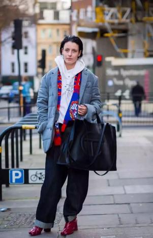 冬季御寒怎么少得了棉服呢?选一件有型的白色连帽卫衣搭配蓝色棉服,加上黑色阔腿裤,给整体造型增添不少活力。