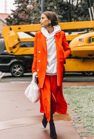 想要出彩出街,那么用白色连帽卫衣搭配红色单品再合适不过了,与红色西装外套和红色半身裙的组合让你备受瞩目。