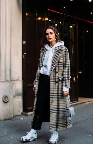 格纹外套每一年都很火,搭配白色的连帽卫衣和黑色休闲裤就够了。脚上可以选择一双白色厚底帆布鞋,清新有型。