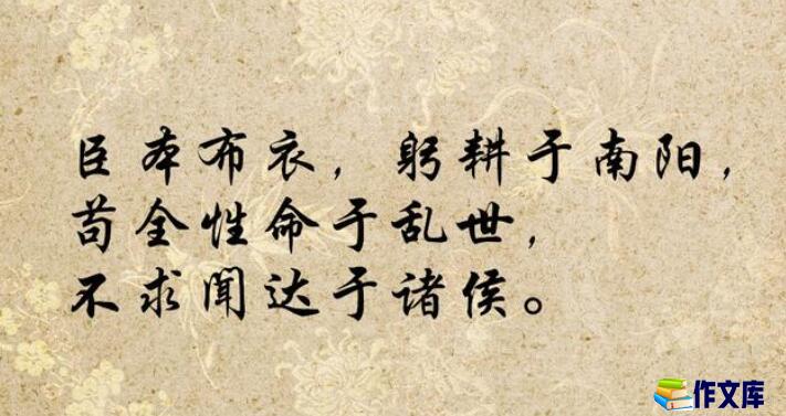 臣本布衣,躬耕南阳,苟全性命于乱世,不求闻达于诸侯。先帝不以臣卑鄙,猥自枉屈,三顾臣于草庐之中,谘臣以当世之事,由是感激,遂许先帝以驱驰。后值倾覆,受任于败军之际,奉命于危难之间:尔来二十有一年矣。先帝知臣谨慎,故临崩寄臣以大事也。受命以来,夙夜忧虑,恐付托不效,以伤先帝之明;故五月渡泸,深入不毛。今南方已定,甲兵已足,当奖帅三军,北定中原,庶竭驽钝,攘除奸凶,兴复汉室,还于旧都:此臣所以报先帝而忠陛下之职分也。至于斟酌损益,进尽忠言,则攸之、依、允等之任也。