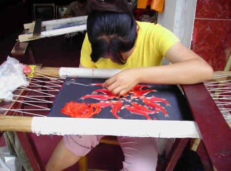 4、戗针:用短直针顺纹样形体一批批由外向内排绣,并可每批按图案的需要换色,可深浅晕色。