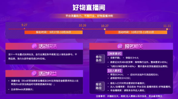 好物直播间是重点扶持的玩法,商家和达人达成报名要求后,在带货抖in好货池分享商品可获得平台的流量助力。