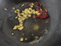 热锅倒油烧热爆姜和干辣椒至出香味。