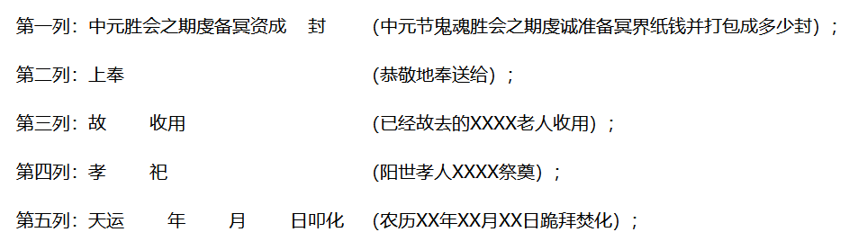 第一列:中元胜会之期虔备冥资成X封(中元节鬼魂胜会之期虔诚准备冥界纸钱并打包成多少封)