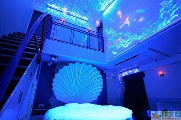 温贝尔马杰克酒店是一家装饰非常精美的日本情侣主题酒店,用美丽的贝壳形状,做成一张洁白的大床,墙上的灯光采用的都是蓝色的灯光,将海洋里的景象投射在顶部大片的留白上,入目便是波光粼粼的湛蓝光影,像是住在了海洋中。