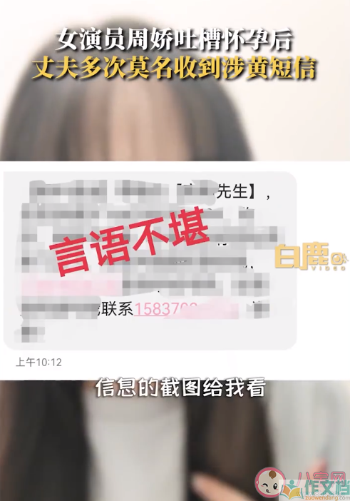 近日,《巴啦啦小魔仙》黑魔仙扮演者周娇发布视频称,自己孕期及生产后,丈夫多次莫名的收到涉黄短信,短信内容以“老婆哺乳期,孕期不方便。来找……”开头。周娇称以前从未收到这类短信,自从开始产检注册某app后便开始收到此类信息,有一次在母婴店买东西丈夫注册了会员没几天后也收到了此类短信。这些人在宝妈孕期、哺乳期发送这类特殊的短信实在太无耻。许多网友跟评称自己在孕期注册了一些母婴APP后,也曾多次收到此类短信或被一些月嫂公司、摄影公司所骚扰。