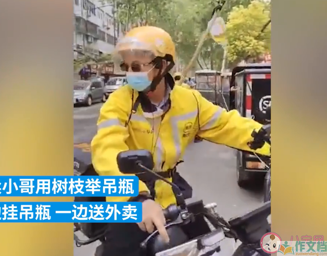 外卖员身绑树枝挂吊瓶送外卖
