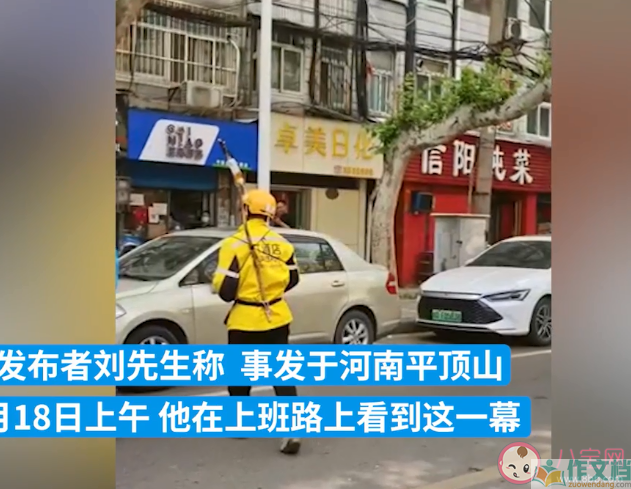 4月18日,河南平顶山街头一名外卖小哥将一根长树枝绑在身后,一边挂吊瓶,一边送外卖。目击者刘先生看到这一幕鼻子不觉发酸,感慨万分,认为这位小哥“挺不容易”。