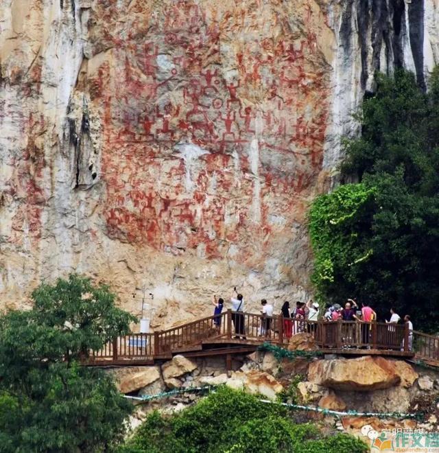 花山岩画,位于广西壮族自治区崇左市宁明县驮龙乡耀达村花山屯北面的明江东岸,画面临江,高44米,宽170米,古人把赭红色的赤铁矿粉用动物脂肪稀释调匀,用草把或鸟羽蘸上,在天然崖壁上直接刷绘出这些神奇的壁画。
