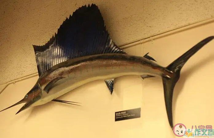 体呈青褐色,有灰白色圆斑。第一背鳍长而高,有黑色斑点,像随风飘展的旗子,故称旗鱼。旗鱼可算是动物中的游泳冠军了,平时速90公里,短距离的时速约110公里,最快可达190公里/小时。
