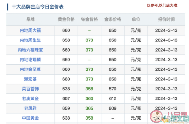 3月13日,记者统计金价查询网的数据显示,尽管比前两日略有回调,几家知名金店的内地零售金价仍维持在660元的高位,周大福、六福珠宝、谢瑞麟、潮宏基等均为660元/克, 周生生658元/克,老凤祥659元/克,周生生658元/克,老庙黄金657元/克。