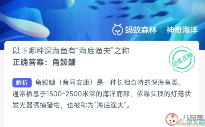 解析:角鮟鱇(音同安康)是一种长相奇特的深海鱼类,通常栖息于1500~2500米深的海洋底部,依靠头顶的灯笼状发光器诱捕猎物,也被称为“海底渔夫”。