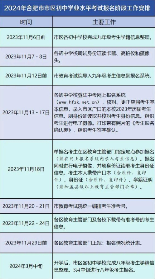 近日,合肥市教育局发布了关于做好2024年合肥市初中学业水平考试(简称中考)报名工作的通知,九年级中考报名工作将于2023年11月13日至17日进行。