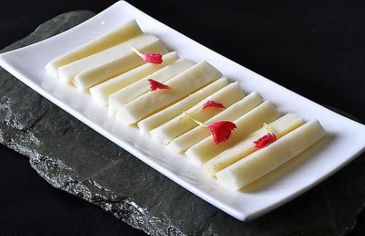 最后再看横切面,山药的横切面肉质应呈雪白色,这说明是新鲜的,若呈黄色似铁锈的切勿购买。