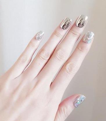 用镜面粉打造的镜面甲,严格来讲也算是一种纯色美甲吧~只是这种独特的颜色,更多了一些细腻的金属光泽,看起来很酷,非常抢眼哦!