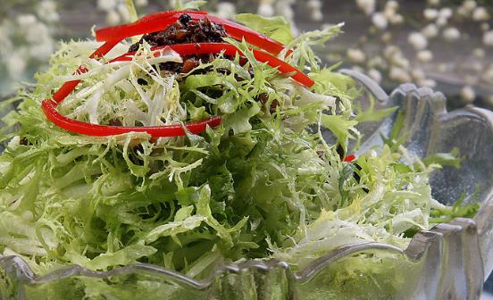 做法3:苦菊洗干净去根,苦菊切断,并加入红萝卜丝。准备一盒豆鼓鱼,撕碎,加调料,盐+蒜末+陈醋+鸡精+糖+一点耗油。松子过一下油,炸一下,最后,放进去菜里,拌匀就可以了。