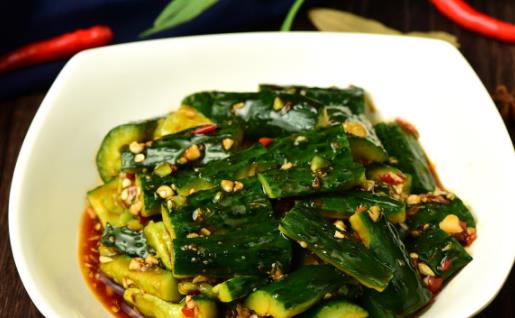 黄瓜所含的钾盐十分丰富,具有加速血液新陈代谢、排泄体内多余盐分的作用,常吃黄瓜既可减肥,还能降血脂,其做法是黄瓜洗净、切条状,大蒜子切末,然后将黄瓜装进一个大碗,撒盐、舀一勺老干妈辣椒酱,接着撒上蒜末、白芝麻和黑芝麻,淋上醋,在锅中倒入适量油,用小火将花椒爆香,最后将热油浇到配料上即可。