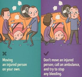 这个道理已经被呼吁很多次,但还是要再提醒一次,如发生交通事故等意外时,除非现在要爆炸或过于危机,否而千万不要任意移动伤者,想要救人的话,可以叫救护车、关闭车子的电源或引擎、帮忙止血、安抚伤者情绪,让他们保持冷静。