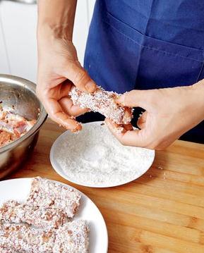 4、第二天取出排骨,使排骨的温度稍稍回升到室温,让每一块排骨裹上一层鸡蛋液,再沾上一层面包糠。