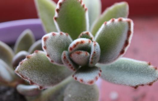 月兔耳(Kalanchoetomentosa),景天科伽蓝菜属,原产中美洲干燥地区及马达加斯加。叶被绒毛,像兔子的耳朵,灰白色,间有褐色斑点,易分支,晚秋到早春生长旺盛。喜阳光充足的环境,阳光充足时叶尖会出现褐色斑纹。夏季要适当遮荫,不能过于荫蔽。
