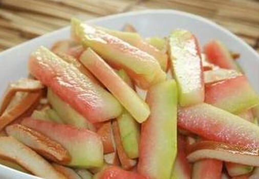 炎热的夏天凉拌西瓜皮是必不可少的。将瓜皮切成细长小块,用少许食盐拌腌二至三小时,沥去盐水,加酱油、醋、麻油等佐料伴食,是清凉爽口的凉拌菜。