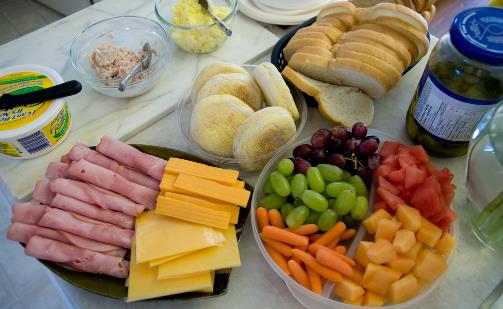 购买:三明治面包、肉松、花生酱、早餐奶、番茄。