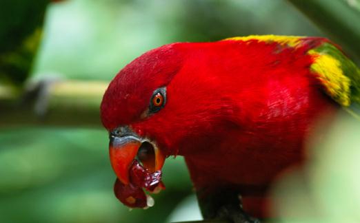 喋喋吸蜜鹦鹉在原栖息地是常见的鹦鹉,也是一般印尼家庭中最常见的宠物鸟之一,因人为盗捕已使数量锐减;大多成对活动,飞行时会发出尖锐吵杂的叫声,可能有季节性迁徙的行为,繁殖期约在1月间;笼养鸟十分活泼与吵杂,很快可适应新环境及主人,喜爱洗澡,它们对其他种类有攻击性,不宜与其它种类一起混养,适应环境后即变的强壮。