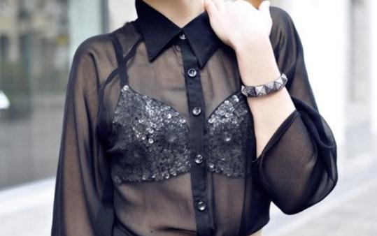 最常见的,也是最适宜搭配和穿着的,当然是雪纺衬衫。雪纺的材质本身轻雹舒适,再配上一点隐隐约约的感觉,立刻和性感妩媚这个字眼擦出了火花。这样的“打底透视”搭配,选择低调一点的同色搭配,优雅与性感并存;或者高调一点穿着撞色的Bra,则更会成为万众瞩目的焦点。