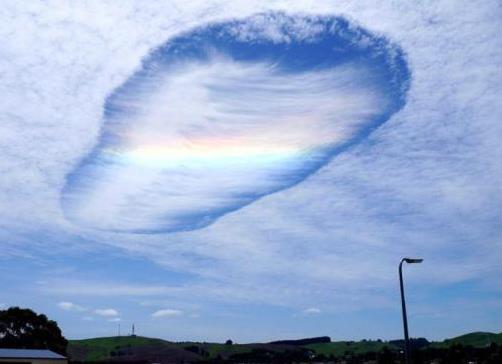 其实这景像被称为雨幡洞或云洞(fallstreak hole)。产生原因是云层中水气凝结成冰晶,形成连锁反应,云朵中就会形成缺口。