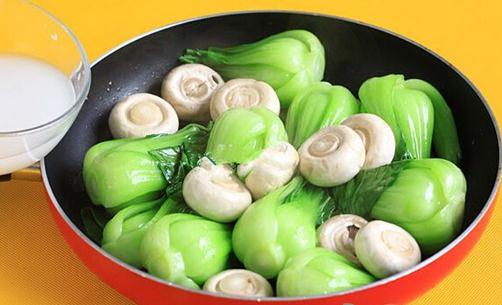 3、调小半碗水淀粉。锅入少油,小火加入油菜或者菜心炒几下,快速加入高汤和口蘑,再加入盐,大火煨1分钟左右。